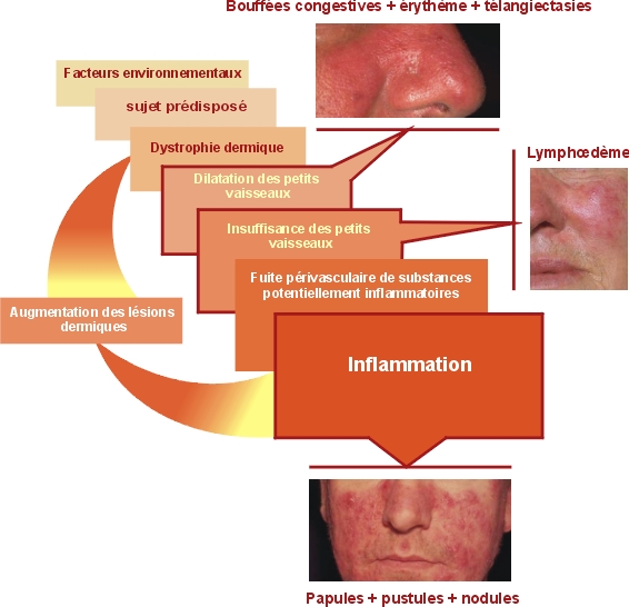 Les patients atteints de rosacée sont prédisposés aux bouffées vasomotrices (flush)et aux rougeurs. Plusieurs facteurs déclenchants sont connus, tels que la chaleur, le froid, les rayonnements ultraviolets, les émotions, l’alcool, les épices ou les boissons chaudes. Les bouffées vasomotrices après absorption d’eau chaude, de café ou de thé sont dues au réchauffement au niveau du pharynx du sang qui irrigue l’hypothalamus du fait de l’échange calorique à contre-courant impliquant la veine jugulaire et les artères carotides. Chez les patients atteints de rosacée, l’hyperthermie entraîne une diminution du flux sanguin du visage au cerveau. Cette dysfonction semble résulter d’un trouble microcirculatoire des veines angulaire et faciale impliquées dans le système de refroidissement vasculaire du cerveau., ce qui entraîne une congestion veineuse et un défaut de thermorégulation. De plus, les veines faciale et angulaire drainent les parties du visage qui sont le plus atteintes par la rosacée, en particulier la conjonctive. Cela pourrait expliquer l’atteinte oculaire fréquente. Une dysfonction vasculaire pourrait aussi être la cause de l’augmentation des céphalées des patients atteints de rosacée.
